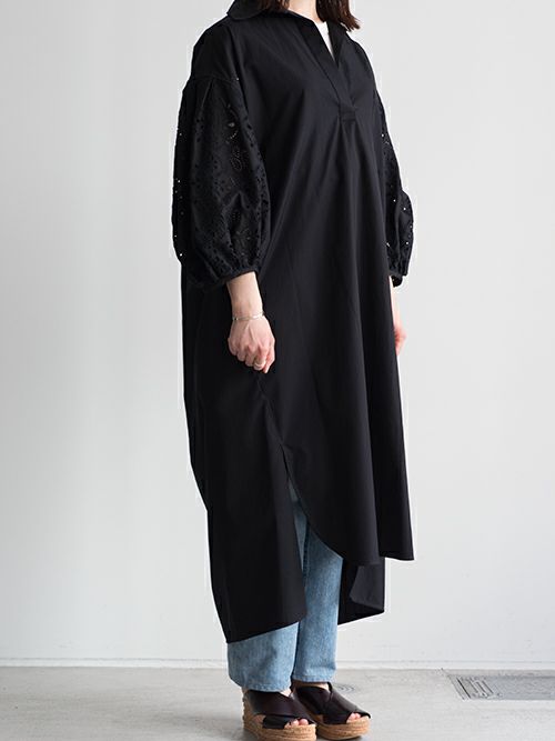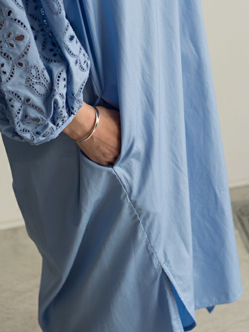 袖のボリューム感とすっきりとしたボディシルエットのバランス感が絶妙なワンピース。適度にゆとりのあるデザインで、楽ちんなのにきちんとして見えるのがポイントです。素材はハリのあるコットンですがポプリン素材でほどよいツヤと光沢が上品な装いに見せてくれます。