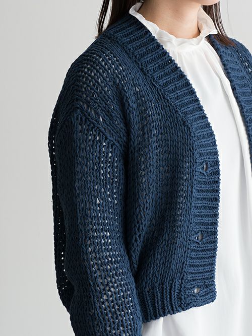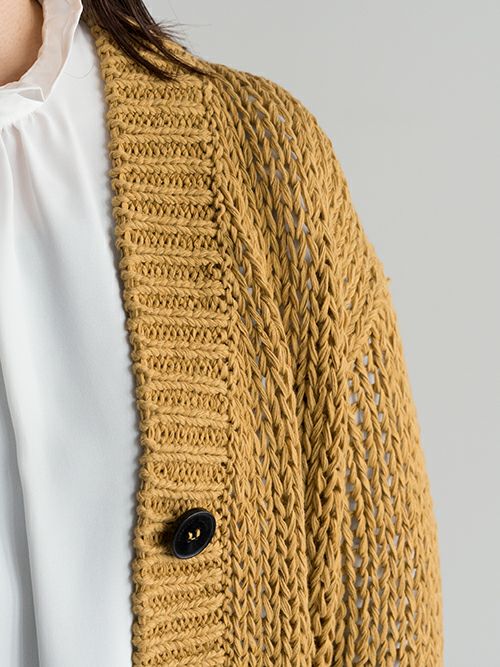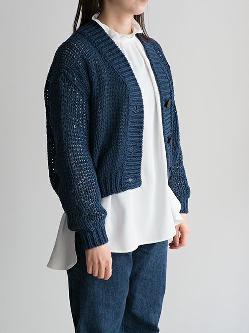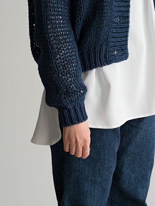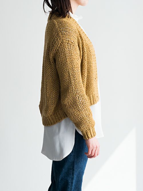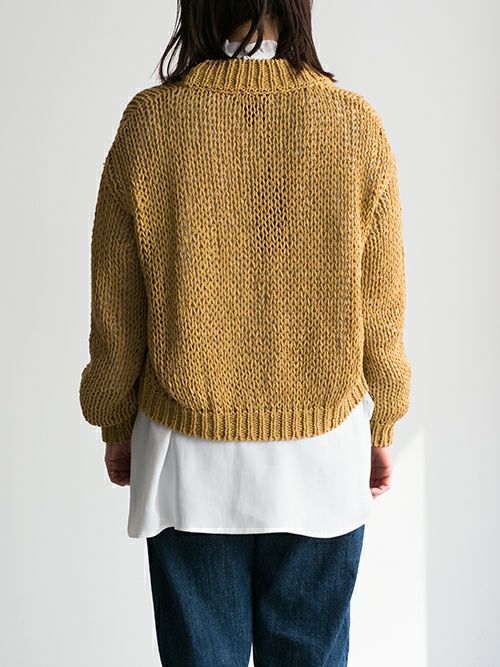 コンパクトで編み感とガーメントダイ(製品染め)の風合いがポイント。ガーメントダイ(製品染め)することにより編み込みのカラーも1点1点同じものがなく自分だけの1着になります。ボトムはワイドめのパンツやワンピースなどにレイヤードしてコーディネートの幅が広がります。