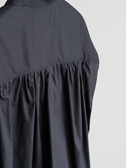 ヨークから細かなギャザーを施し、フェミニンな印象に。後ろ側の裾紐を絞ることでシルエットにアレンジをつける事が出来るので、あわせるボトムスでいろんなスタイルを楽しめます。