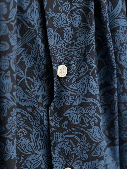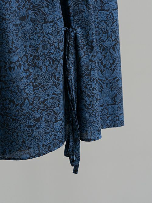 英国を代表するテキスタイルブランドLIBERTY社のテキスタイル。『イチゴ泥棒』という人気のテキスタイルを使用したタナローン素材です。上質な細番手の糸で高密度に織られたローンはしなやかな肌触りと上質な光沢感が特徴です。前後にとったタックがポイントのブラウス。立体的な構造が、薄着になる夏のアクセントに。ウェストのストリングを結ぶと、ウエストマーク出来て、