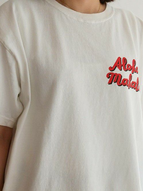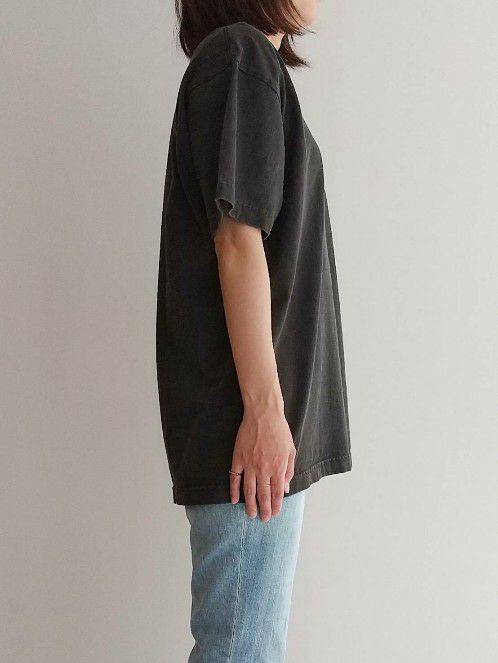 シックなモノトーンカラーに胸元にポップな筆記体のレタードTシャツ。着心地も初めから軽く、ストレスフリーな肌触り。ボリュームのあるパンツやスカートなど、ボトムスを選びません。インナーには勿論のこと、一枚でもサマになるカットソーです。