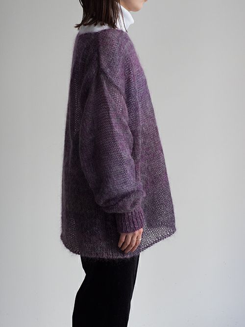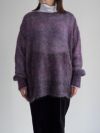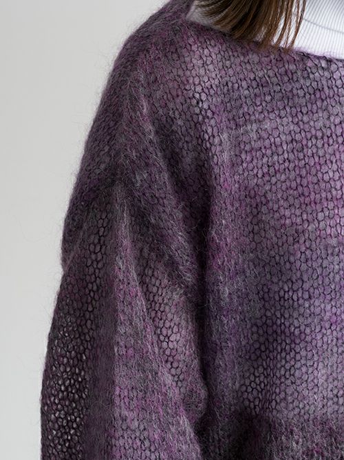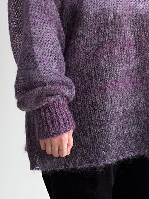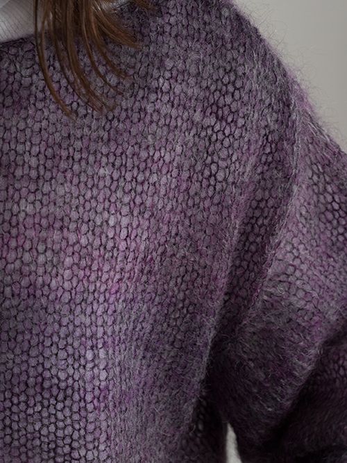2本の高級キッドモヘヤを引き揃え軽さと温かさを同時に追求した、ロングピッチのカスリ染め糸を使用したニット。透け感があり重ね着を楽しめるゆったりしたニットです。