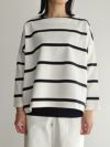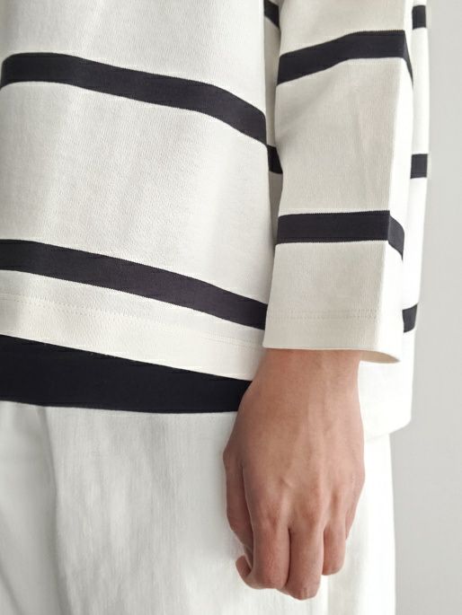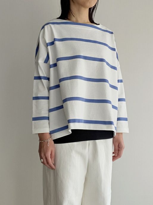 一枚でシンプルに着用できるボーダーカットソー。袖はドロップショルダーで手首にかけて細くなっており、ゆったり目な身幅に対してバランスよく見せてくれます。デイリー使いも出来、着丈はコンパクトで合わせるボトムスも選びません。