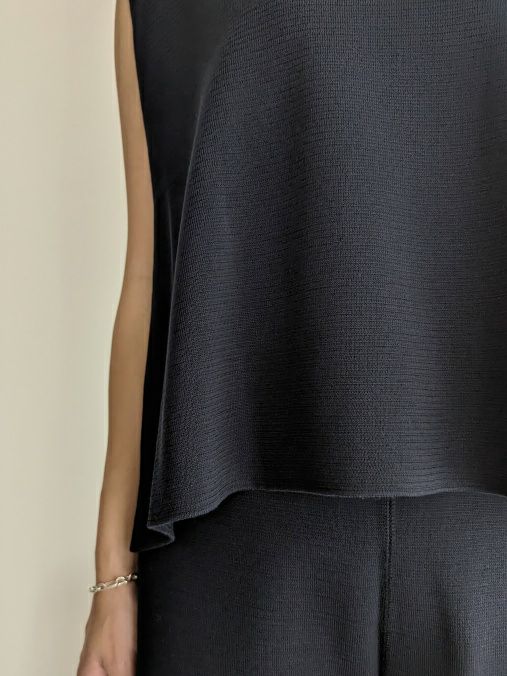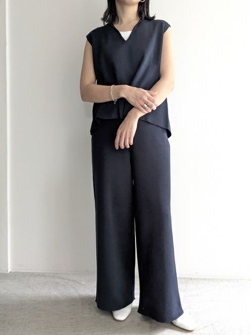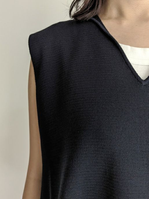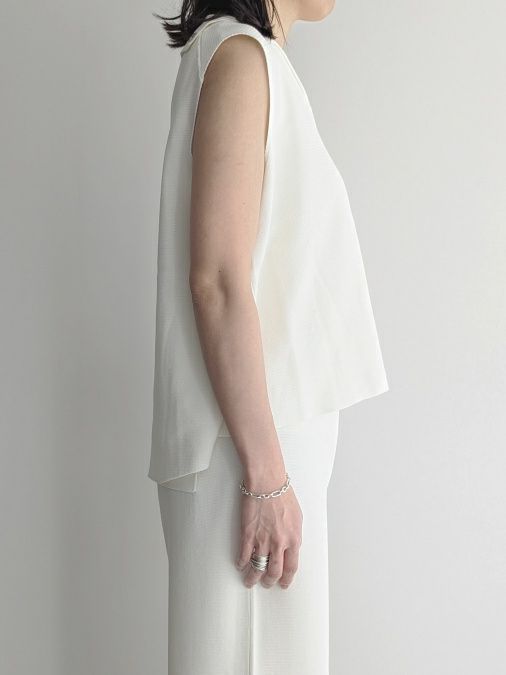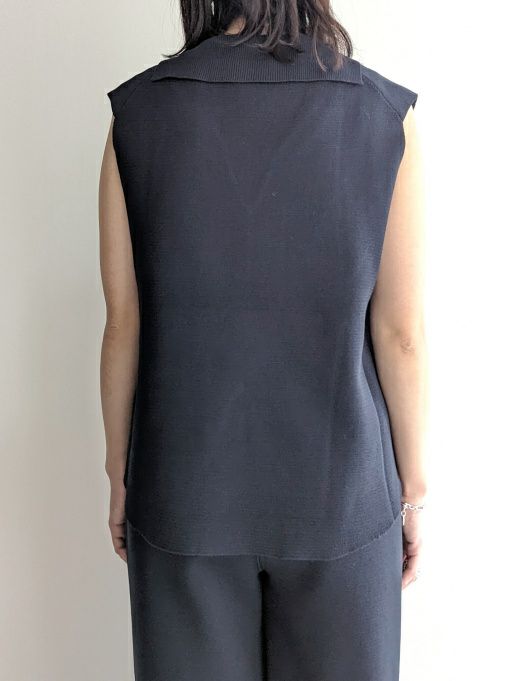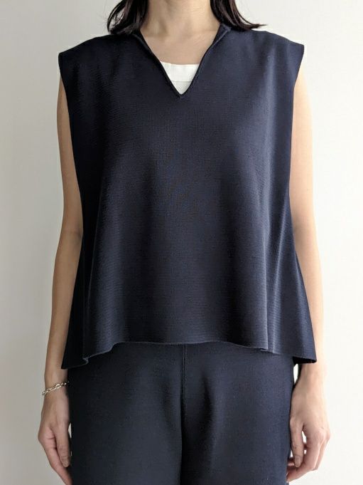 軽く柔らかく非常に着心地の良い糸を使用した、ミラノリブのノースリーブです。小さめのセーラーカラーがクリーンな印象で、きちんと見えるのに楽ちんで、構築的なフォルムとミニマルなデザインがとても洗練されています。上質なBCIコットンと膨らみのあるブライトポリエステルを複合した糸は上品な光沢があり、編地が非常に美しく形状安定も優れているのが特徴です。ご自宅での手洗いは可能です。