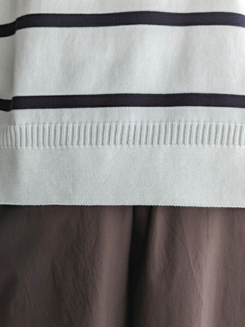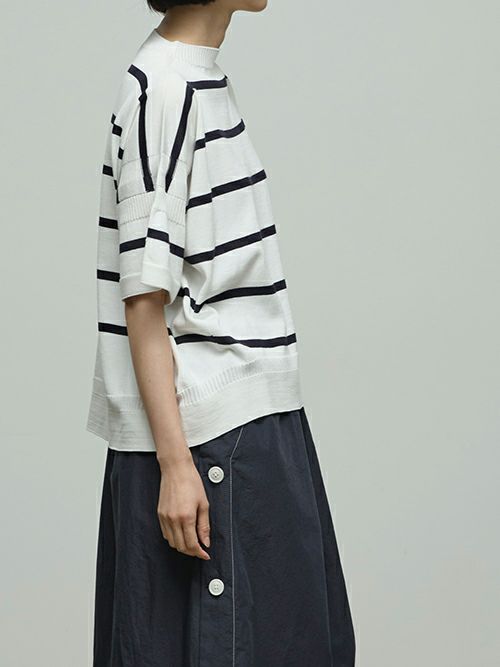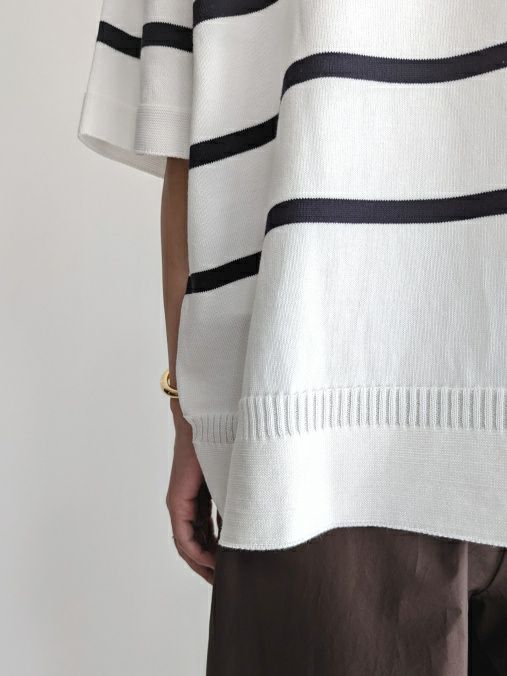 オーガニックコットンの中でもピュアホワイトと呼ばれる糸にこ だわったニットシリーズです。Tシャツ感覚で着られる定番の半袖ニットプルオーバー。体のラインを拾わないゆとりあるシルエットと、肘まである5分袖が気になるところをカバーします。ベーシックなボーダー柄に、シルエットで遊び感をプラス。