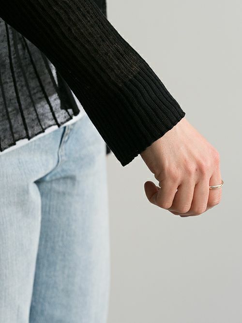 シルエットはドロップショルダーで袖口のみをシルクの糸を使いさり気なく肌あたりをソフトにしてくれます。ボリュームのあるボトムやワンピースなどのコーディネートにオススメです。