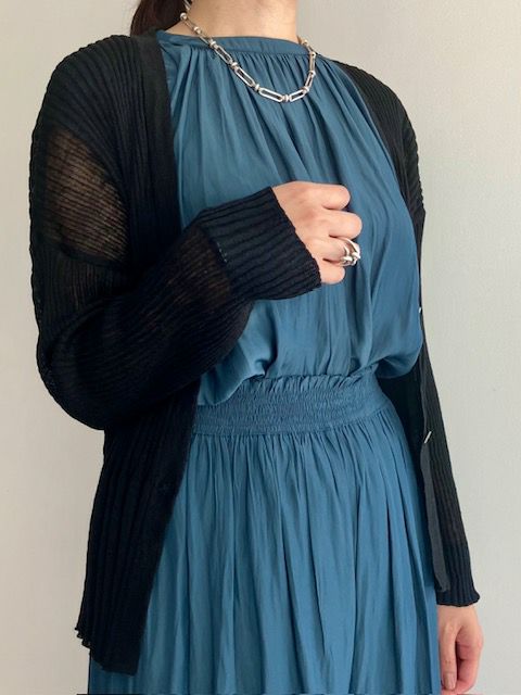 透け感のあるVネックのリブニットカーディガン。着丈が少しショートでサイドのスリットも女性らしさを演出してくれます。リネンの細い糸番手を使用し光沢と柔らかな透け感が初夏から夏の上品な羽織におすすめです。