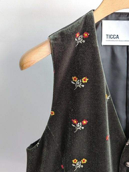 ベロア生地に花柄刺繍をあしらったレトロ感が可愛らしいベスト。コンパクトなサイズ感や、後ろ見頃に別地を使用するなど、敢えての本格的なドレス仕様が、お洒落で個性的なコーディネートを作りだしてくれます。