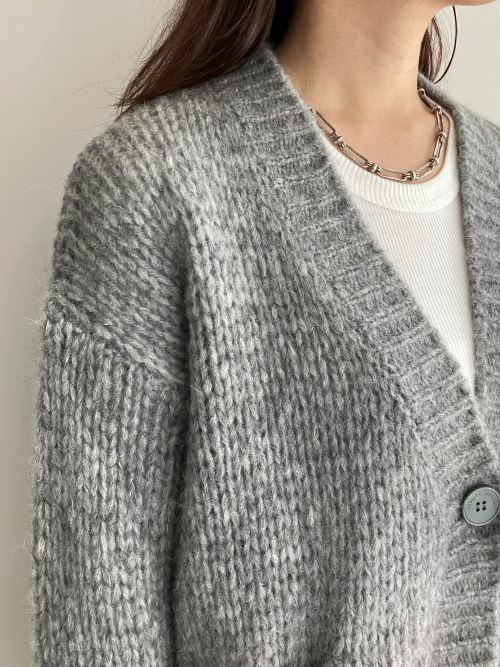 ふんわりした柔らかな編みのVネックカーディガンでシンプルなデザインですが、ネックや袖のリブなど、細部まで拘りが詰まった1着。身体がそよぐゆったりしたラインで、重たくなりがちな秋冬スタイリングのアクセントカラーとなりお薦めです。