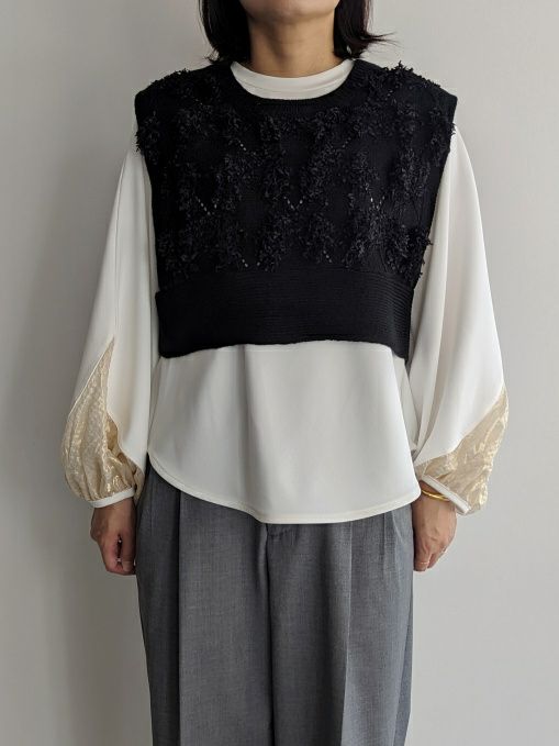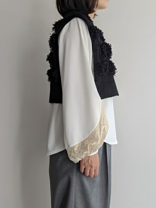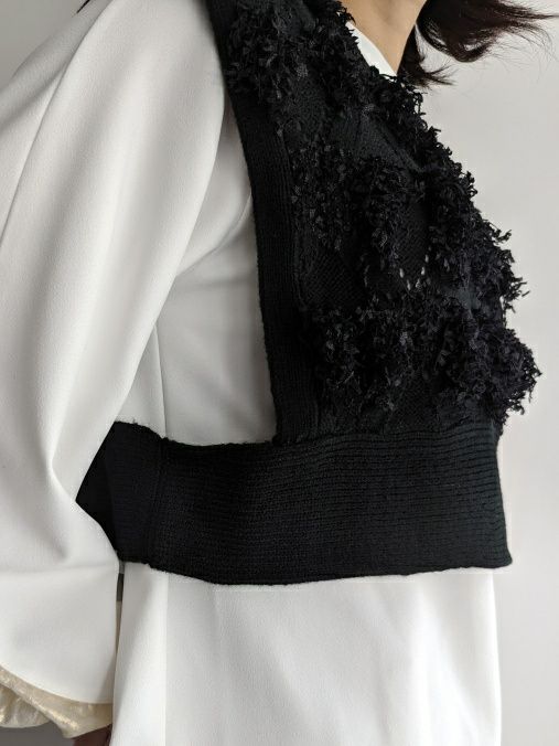 ボーダー状にテープヤーンを編み込んでからカットする事で、通常の糸よりもボリュームのあるフリンジに仕上がっています。ベースの編地は柄を組んでフリンジとなじむようなデザインです。端はあえてリブではなく片畦でスッキリと仕上げ、直線的な切り替えにしています。着丈は短めでトップスやワンピースと重ねると、ニットの切り替えのようなバランスで着用することができます。季節長く楽しんでいただけるベストです。