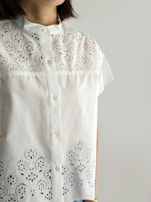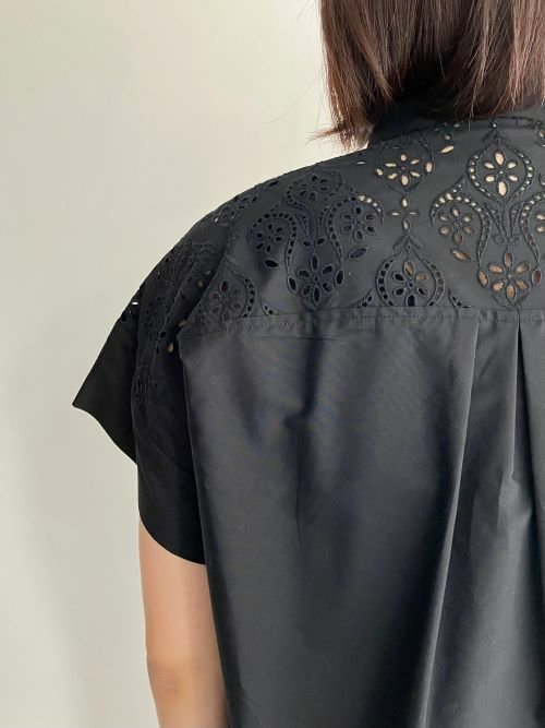ヨーク部分は総レース、裾は同じ柄のパネルとスカラップにレース生地を使用したシャツブラウス。レースの甘さときっちりした衿元で凛とした雰囲気がでるシャツブラウス。前後のレース裾のカットが異なりサイドからの広がりもキレイです。