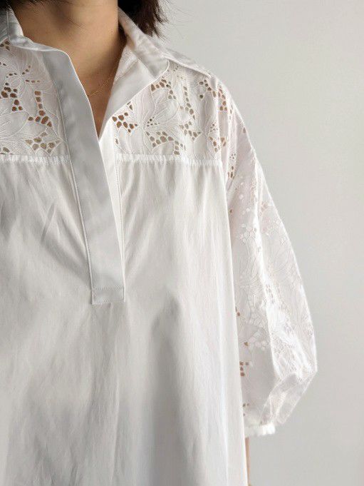 高密度のポプリン生地に直接エンロイダリーレース機で刺繍を施したワンピース。柄は、木蓮をモチーフにした TICCA オリジナルレースです。