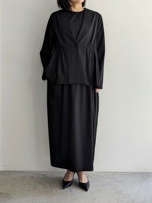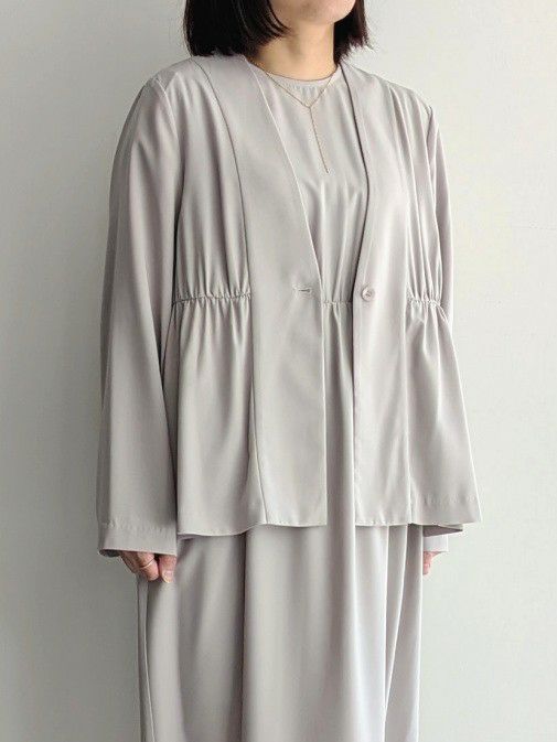 きちんと感も残しつつ、ウエストギャザーが女性らしい柔らかな印象。カーディガンのように軽く羽織れる手軽さも魅力的な一着です。