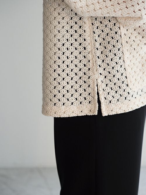 太番手の糸をざっくりとしたラッセル編みで仕上げたレースジャケット。ニットに比べて型崩れしにくい性質を持ってます。