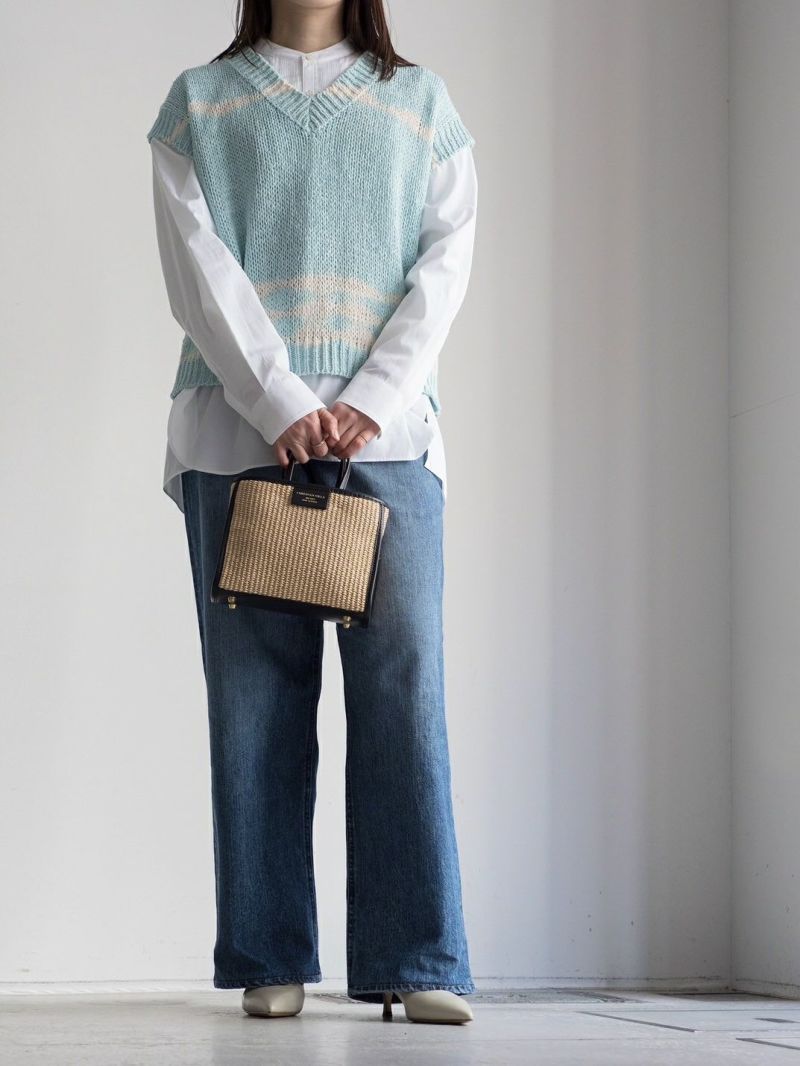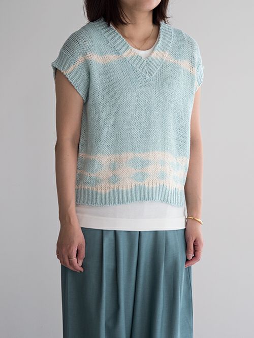 コンパクトで編み感とガーメントダイ(製品染め)の風合いがポイント。絞り染めで1点1点同じものがなく自分だけの1着になります。ボトムはワイドめのパンツやシャツワンピース、カットソーなどにレイヤードしてコーディネートの幅が広がります。