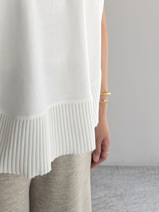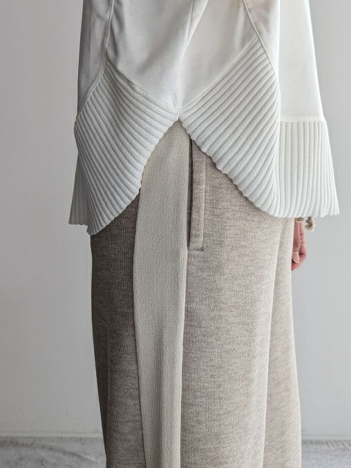 ハイゲージのキレイめなポンチ素材に、シャリ感のある綿ポリエステルの異素材を裾にドッキングした、丸みのあるフォルムが魅力のプルオーバー。1枚で主役になる存在感のあるアイテムです。