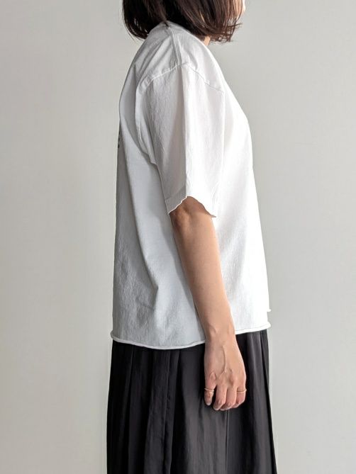 ワイドシルエットで、着心地は軽くストレスフリーな肌触り。ボリュームのあるパンツやスカートなど、ボトムスを選びません。