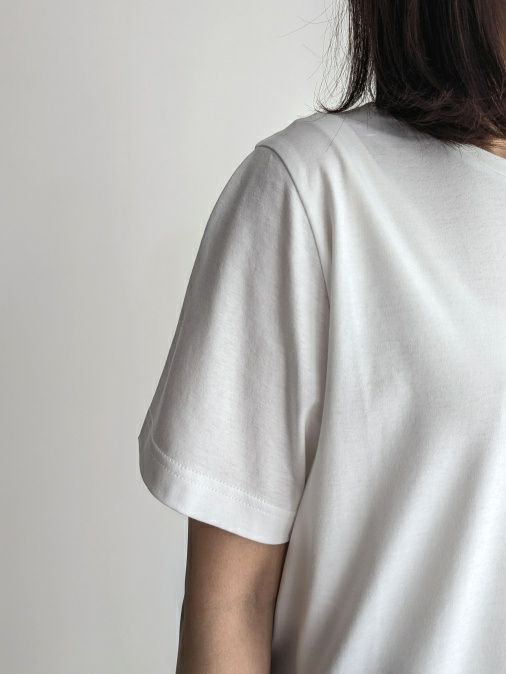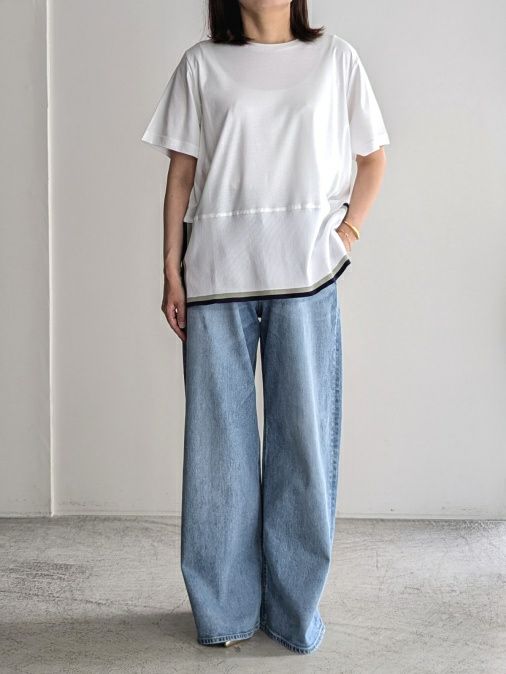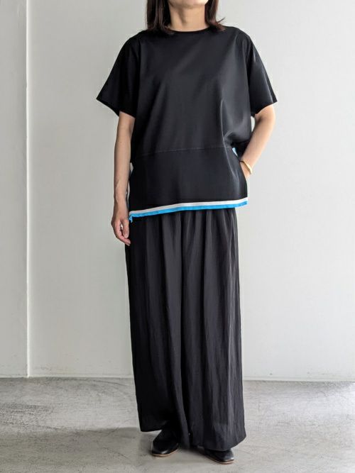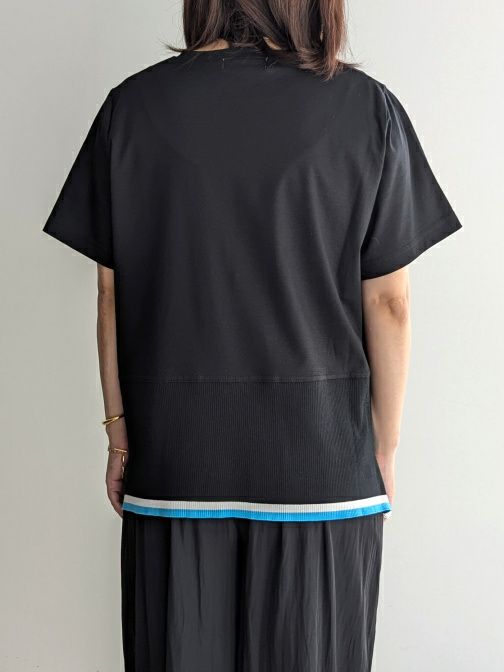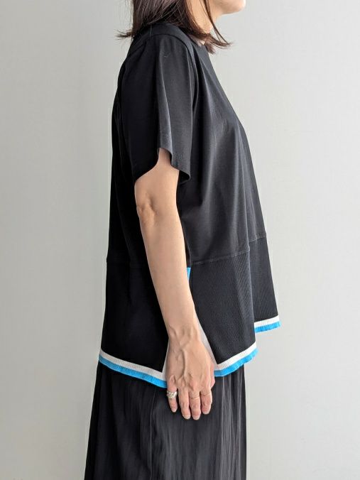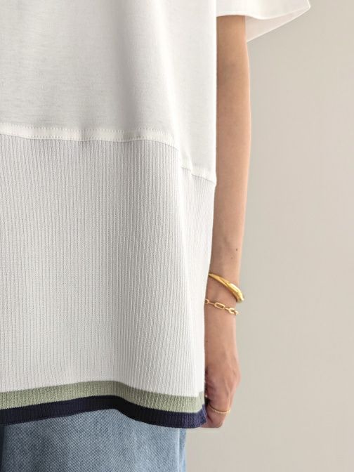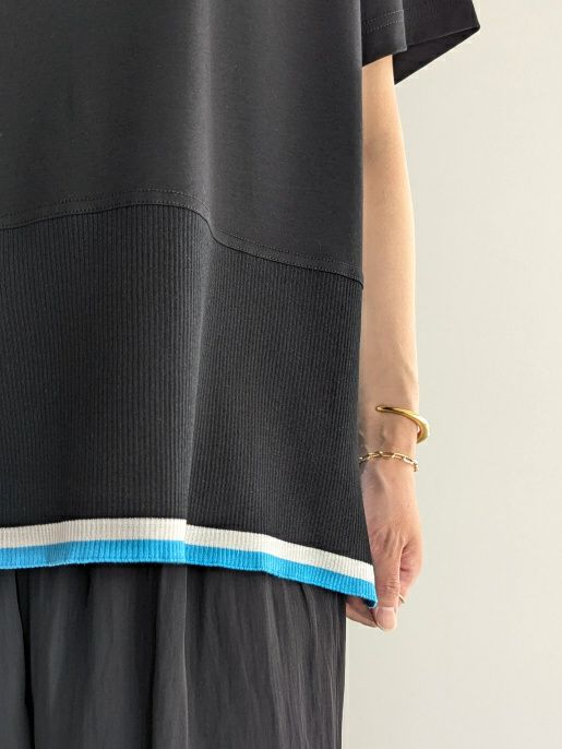 シンプルながらも立体感の出るドッキングリブがアクセントとなり、一枚でコーディネートの主役になるトップスです。やや短めの袖丈ながら、肩幅にゆとりを持たせることで、程よい長さの半袖シルエットに仕上げました。ネックはシンプルなカットソーでアクセサリースカーフなどパッと明るく見せてくれるのも嬉しいポイントです。