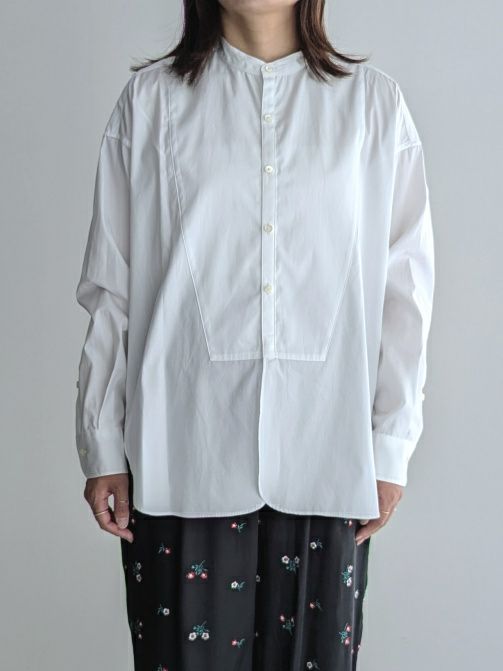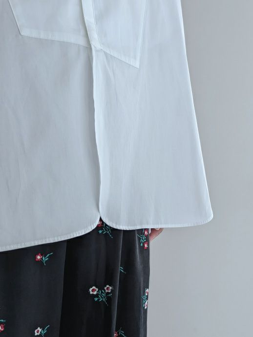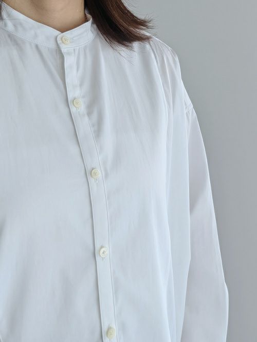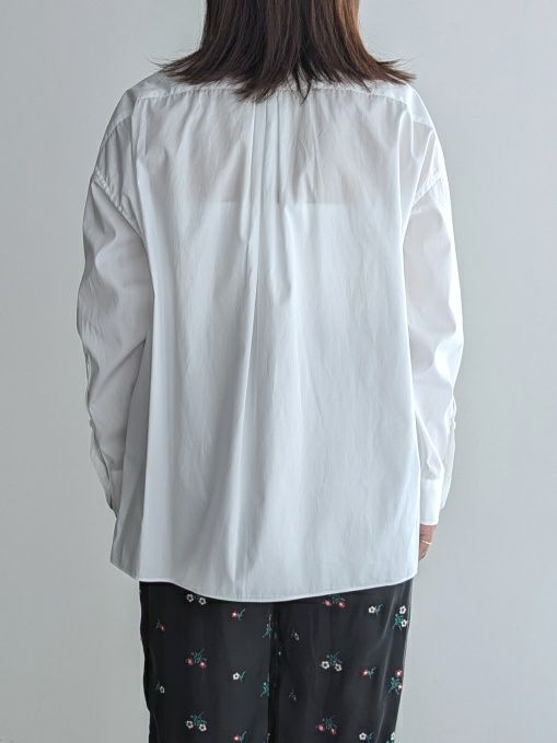 ヴィンテージのディテールをモードに昇華し、一見スタンダードなシャツに見えて細かいディテールが随所に光るデザイン。身頃にはゆとりのあるシルエット。清潔感の中にもリラックスムードがあり、ボトムを選ばずにあらゆるシーンに対応します。ブラウスのような軽やかさの両方を楽しめる1枚です。 素材にはトップクラスのドレスシャツ素材を使用しています。 しなやかで極上の使い心地と透明感を纏い、美しい表情と上品な存在感が印象的な1枚です。 お洗濯後の洗いざらしの表情も上品なリラックス感が続き、エイジングも楽です。