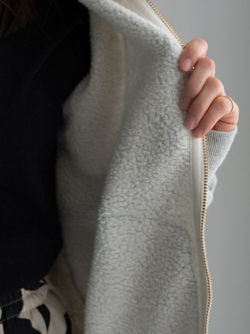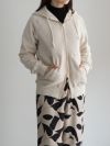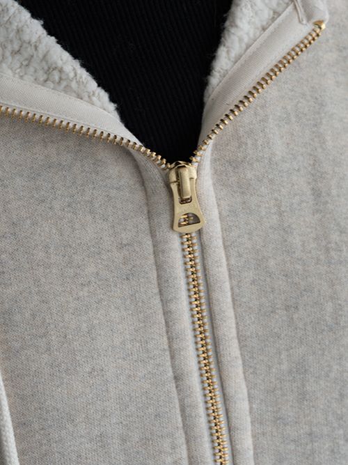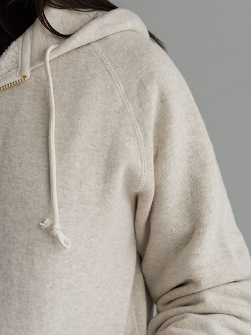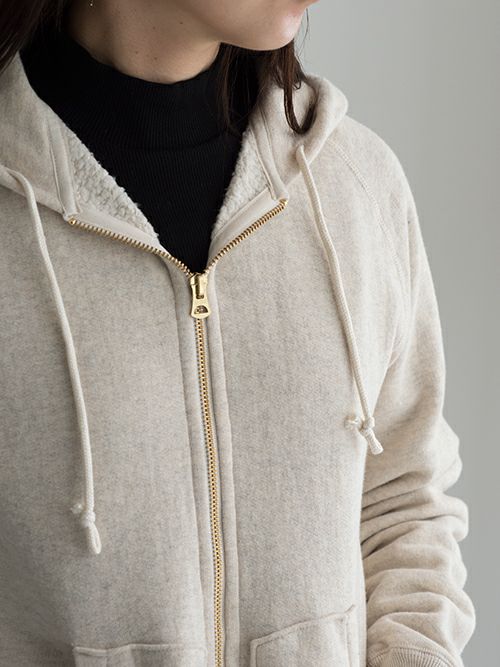 Kepaniの代表的モデル、ブランド誕生時より展開しているモデルでもありラフィー糸は、超長面綿と落ち綿を混ぜて作られ、ムラ感と柔らかさを持たせて、旧式編み機で緩めに編み、保湿性と肌触りを重視。洗ってもしなやかさを失わず、形が戻る再形成性が高いです。フード付きダブルジップパーカーでラグランスリーブ、見た目はややタイトにですが、伸縮性があるので締め付け感は少ないです。ゴールドジップがアクセントになります。