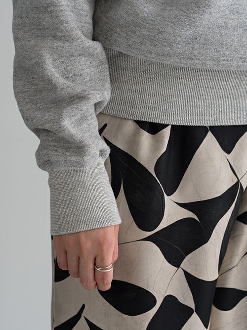Kepaniの代表的モデル、ブランド誕生時より展開しているモデルでもありラフィー糸は、超長面綿と落ち綿を混ぜて作られ、ムラ感と柔らかさを持たせて、旧式編み機で緩めに編み、保湿性と肌触りを重視。洗ってもしなやかさを失わず、形が戻る再形成性が高いです。クルーネックの前後両方にV字ガゼットを配置し、ヴィンテージスエットの意匠を取り入れており、肩はラグランスリーブで動きやすく、リブがしっかりしており伸縮性が高いです。シルエットは程よくフィットしつつ締め付け感はなく使いやすい定番スエットです。