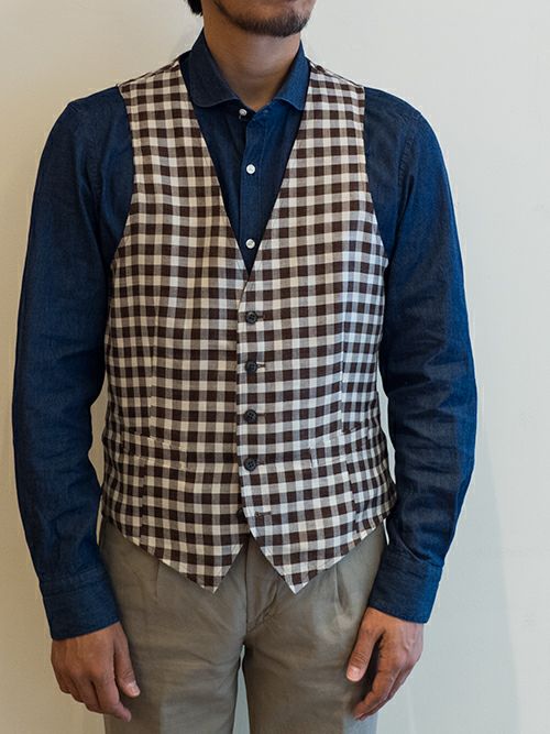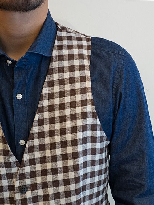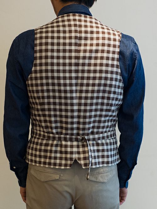 通常オッドベストは後身頃をキュプラなど異素材にすることが多いのですが、同素材を用いることにより幅広く着ていただけるように仕上げました。