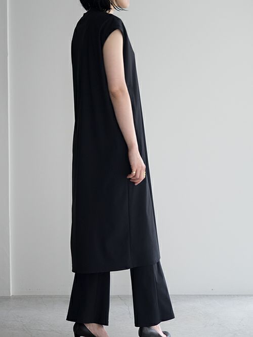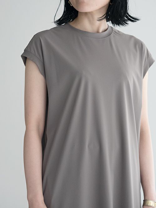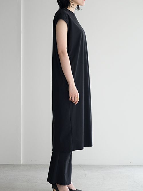 ストレッチ素材でさらりとした着心地のワンピース。片側には深くスリットが入り、パンツやロングスカートなどとのコーディネートを幅広く楽しめる一着。