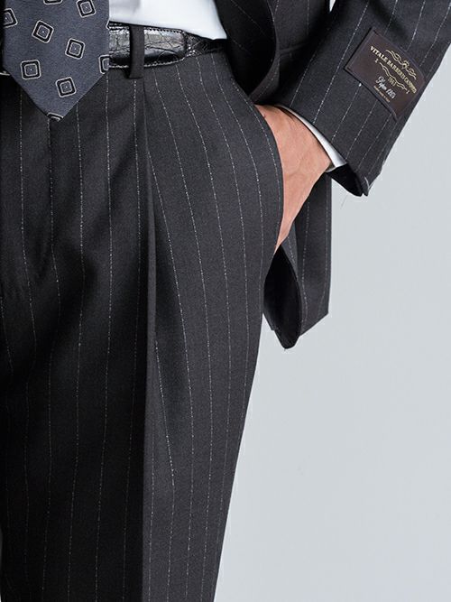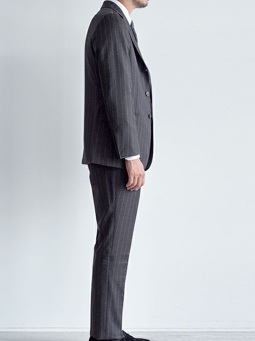 ジャケットはノッチドラペル、フラップポケットで3つボタンの段返り仕様。毛芯には本バス毛芯(馬の尾毛)を使用し、衿元から胸にかけてハリを与え立体的なシルエットをになります。毛芯の中でも最高峰の物を使用しております。
