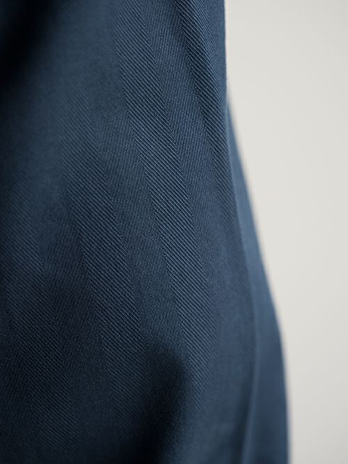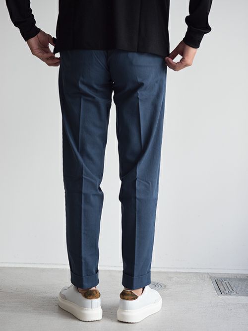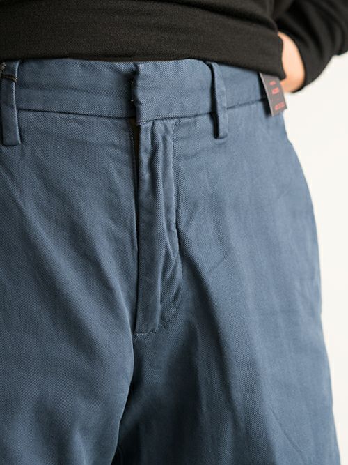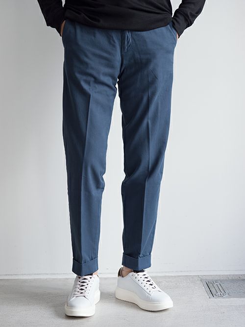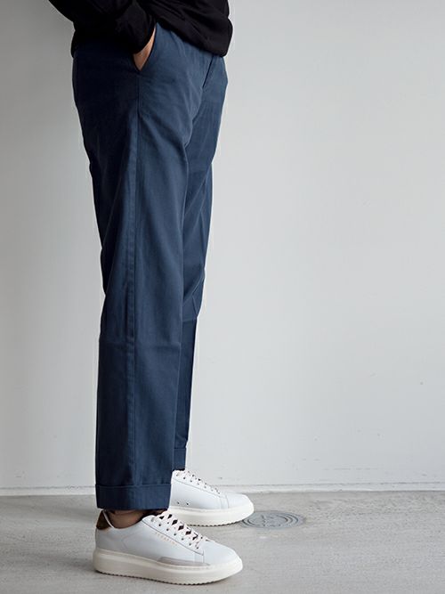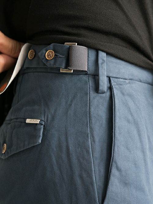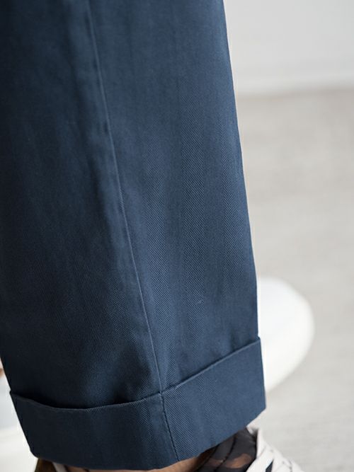デザイン性もあるボタン止めのサイドアジャスター。生地はヘリンボーンのカジュアルパンツです。裾に向けてテーパードを効かせたシルエットに太めのダブル仕様もアクセントになります。