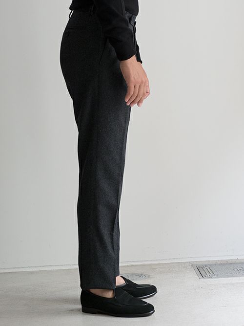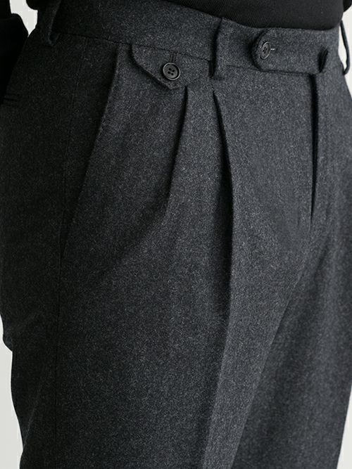 腰回りには程よい余裕を持たせ膝下はしっかりとテーパードを効かせたツープリーツ秋冬パンツ。