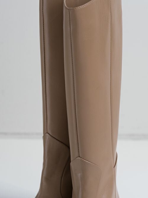 フラットソールに見えますが、かかと部分に約2センチのインヒールが入っており、足が疲れにくい構造になっています。トレンド感のある少し太めの筒なので、スカートやワンピースはもちろん、パンツと合わせたブーツインのスタイリングもおすすめです。