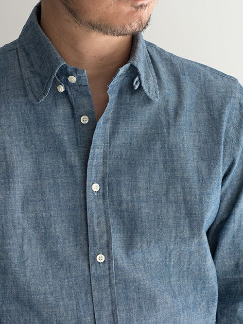 襟の丸みが美しいシャンブレー生地のタブカラーシャツ。