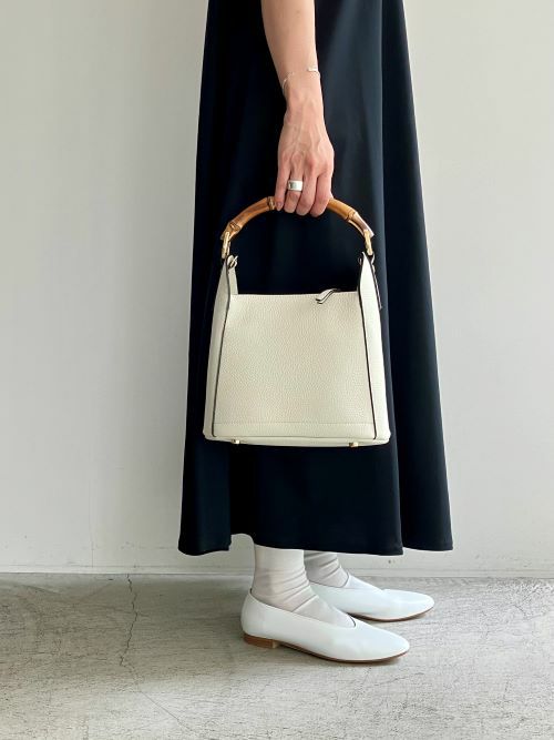 まるで飾りたくなるインテリアの様なフォルムが愛らしく高級感あるバンブーハンドルで品の良い印象になります。ショルダー付きでオンオフどちらもご使用しやすいです。