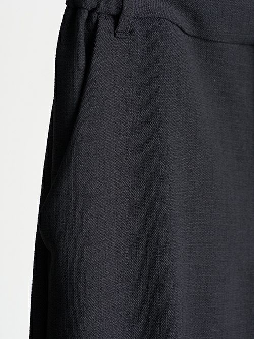 スッキリした渡り、高めに設定した膝位置から裾にかけてストンと落ちる美脚パンツセンタープレス入り両脇ウエストにゴムが少し入っており前ウエストはスッキリ見えるように仕上げています。素材はペットボトルからのリサイクルポリエステルを使用したサスティナブル素材を使用。撚糸に強弱をつけて麻のような凸凹があり、全方向ストレッチ、防シワ、給水速乾、イージーケアと機能的です。裏地もストレッチが効いていて、ストレスフリーな着心地になります。凹凸感がある、ランダムリブのトップス。さらっとした手触りや、ストレッチが効いており、夏もストレスなく着用できます。足元のカットラインが、さりげない抜け感を演出してくれます。同生地素材のプルオーバー