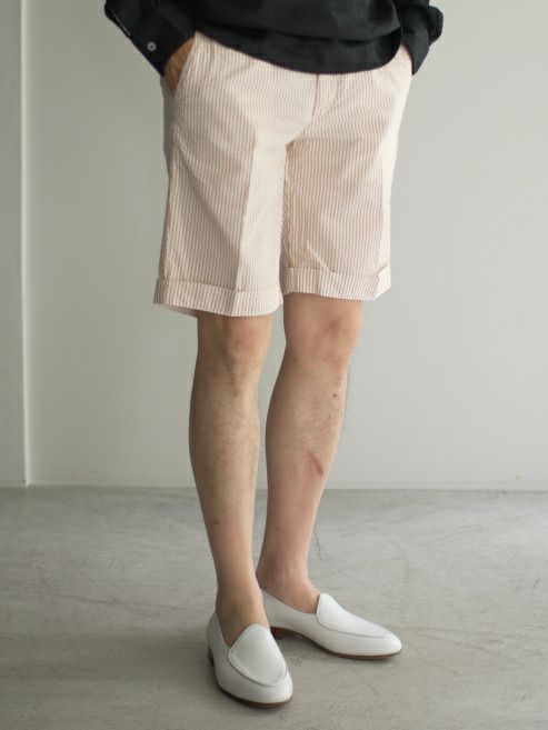 春夏らしい爽やかなカラーリングと、シアサッカーならではの軽やかな生地感のショートパンツ。ラフになり過ぎない大人のカジュアルスタイリングに最適な一本です。