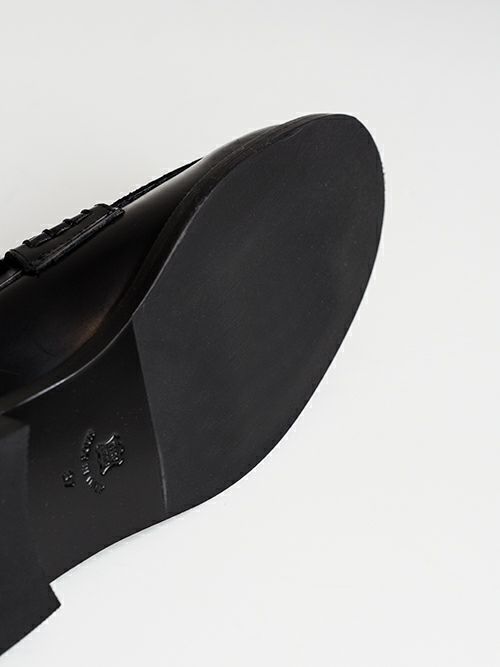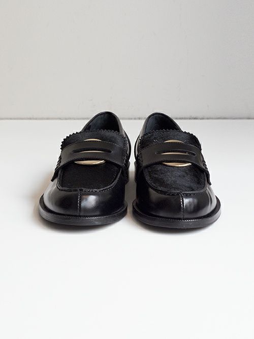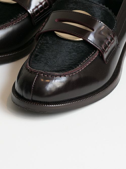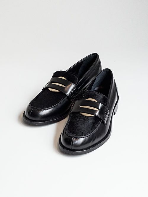 アッパーに表革とハラコのコンビで仕上げる事で新鮮な佇まいのコインローファー。ラウンド型の金具も特別感を演出するアクセントになっています。
