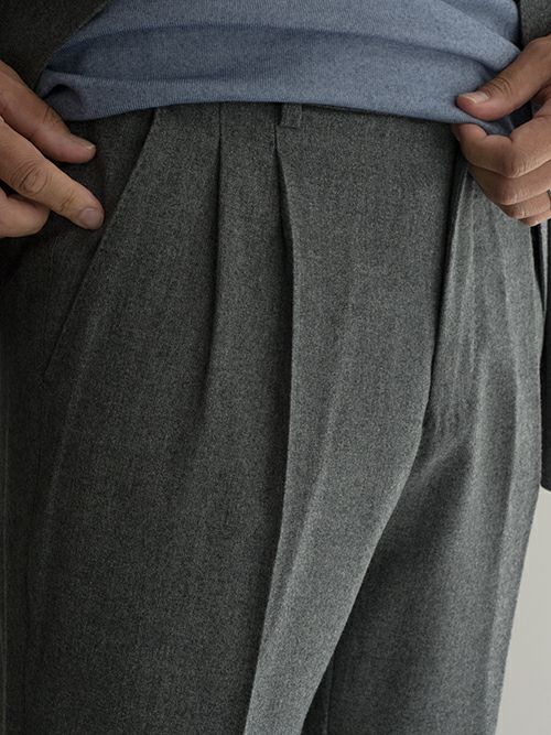 ノッチドラペル3つボタンの段返り、ポケットはバルカパッチ仕様。サイドベンツで一枚芯の軽快なジャケットに仕上げています。パンツは2タックのウエストはドローコードとベルトループの2WAY仕様です。