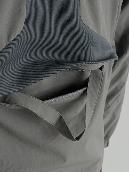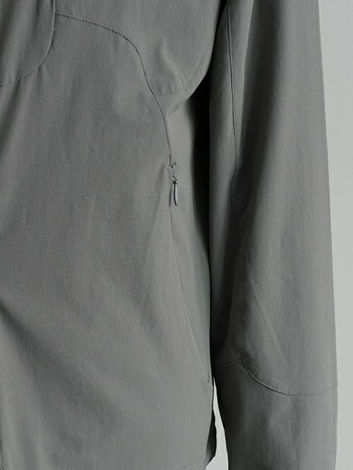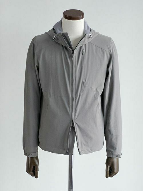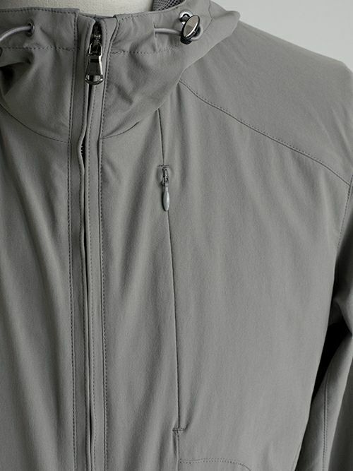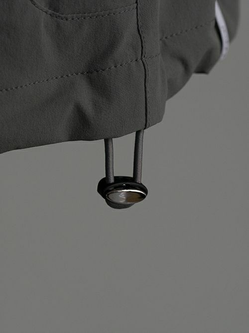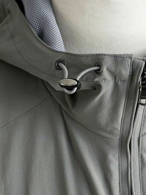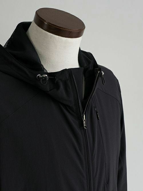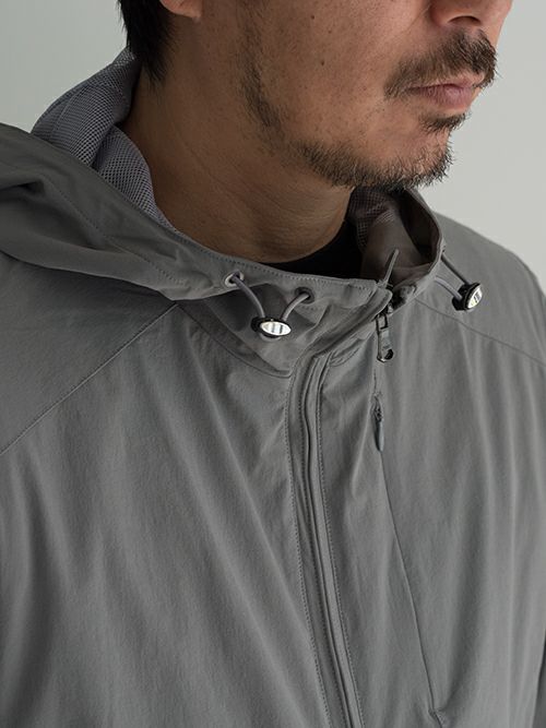 特殊な工程で縫製しており、着心地とシルエットに拘ったフードパーカー。東レのナイロンを使用した4wayストレッチ生地に、背面のテレコ素材リブをプラスする事で、様々なシーンに対応できる可動域を実現しました。同じく背面のジップを開ければ、畳んで仕舞えるパッカブル仕様なので、着心地だけでなく持ち運びにもストレスがありません。