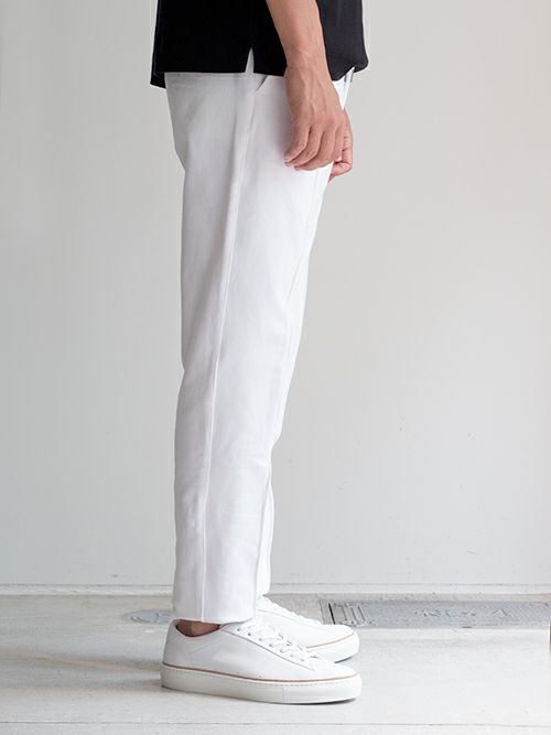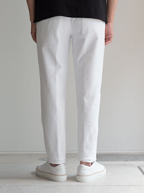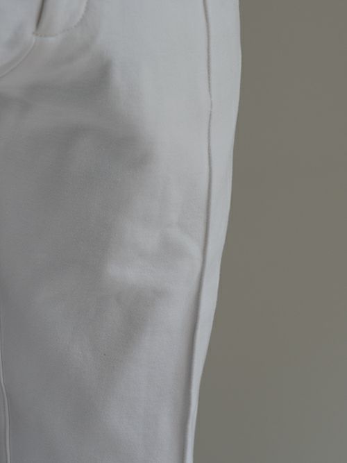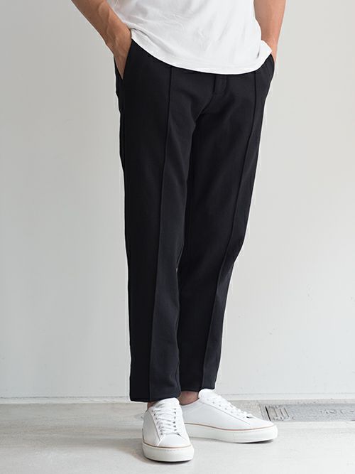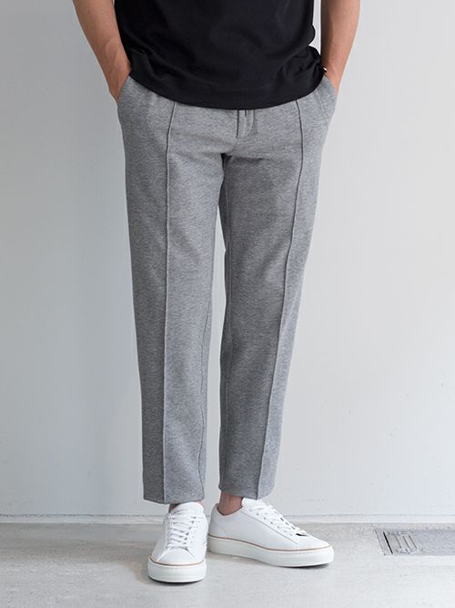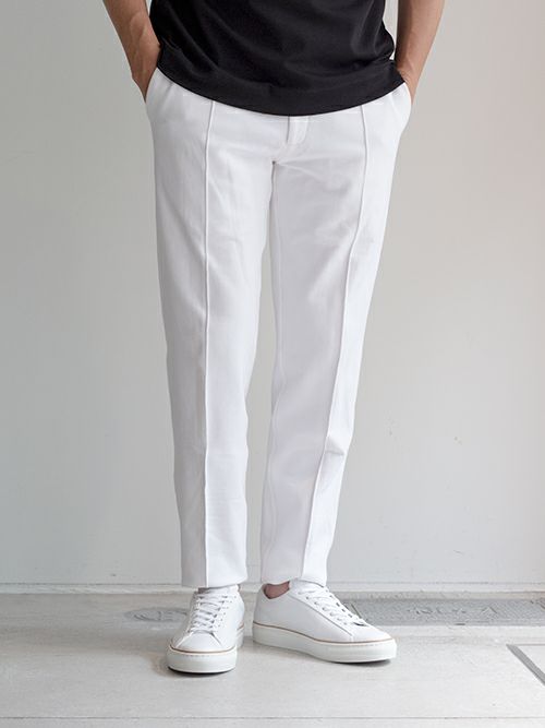 Tシャツなどのカットソーをトップスに持ってきていただくと、パンツのスポーティーな印象とフィットしてくれます。少し艶のあるスムース生地ですと、上品な大人の雰囲気が出ますので、より一層お薦めです。
