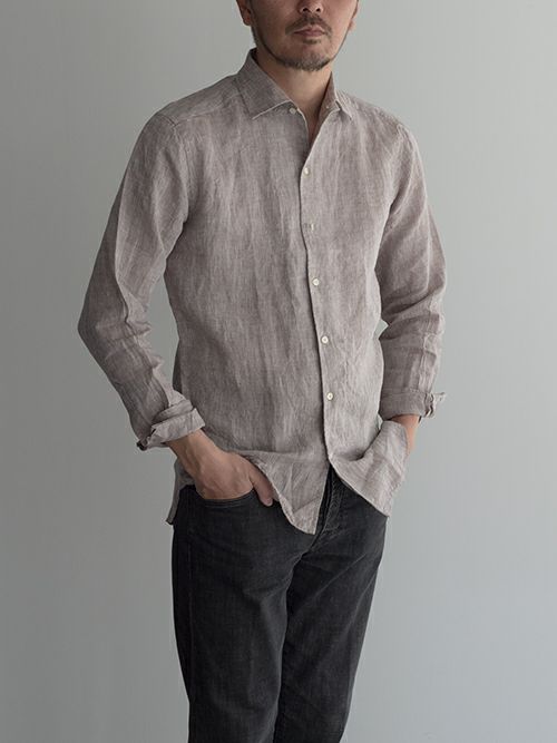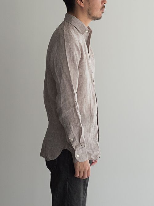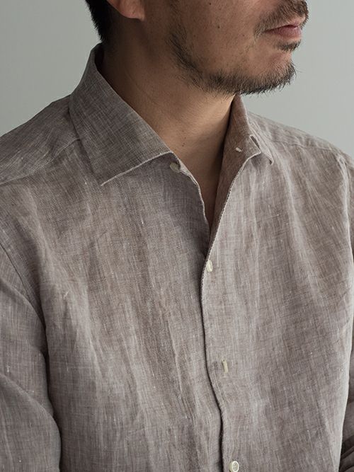 今年らしいアーシーなBROWNと、綺麗なBLUEに心惹かれるリネンシャツ。シルエットは比較的すっきりと細身で、夏場のジャケットインナーとしても重宝する一着です。