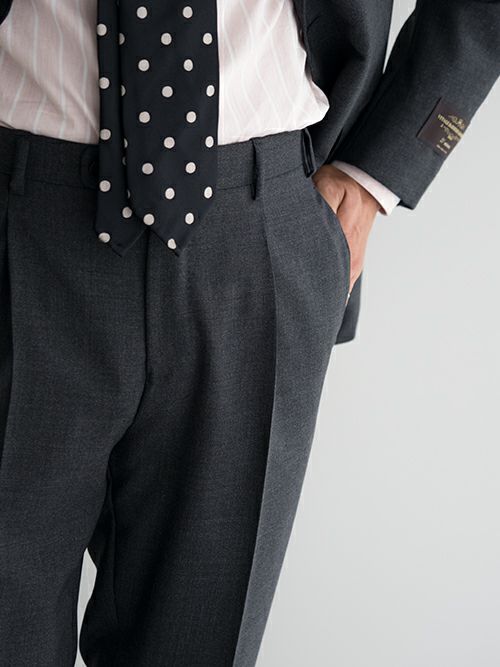 イタリア生地のVITALE BARBERIS CANONICO(ヴィターレバルバリスカノニコ)の生地を使用した、軽やかな着心地の春夏のスーツ。タイドアップや、インナーにニットと合わせるなど、幅広く着用いただけます。ジャケットはノッチドラペル、フラップポケットで3つボタンの段返り仕様。毛芯には本バス毛芯(馬の尾毛)を使用し、衿元から胸にかけてハリを与え立体的なシルエットをになります。毛芯の中でも最高峰の物を使用しております。