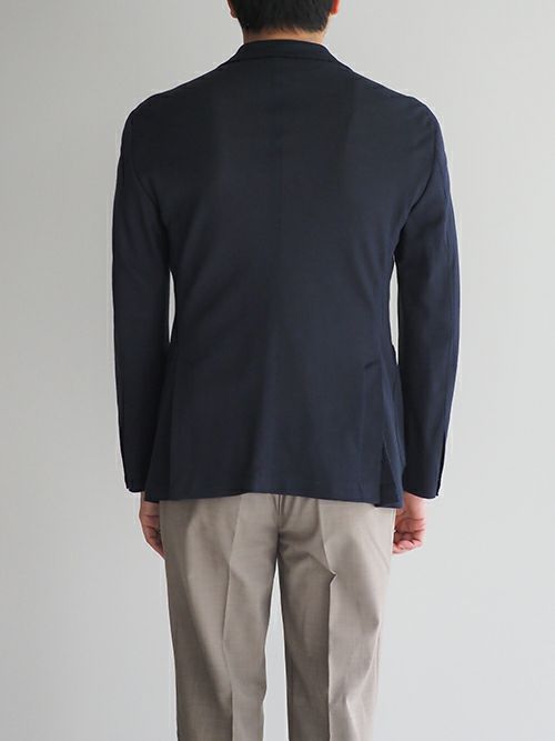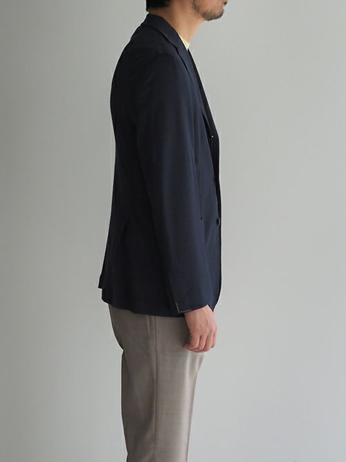 ノッチドラペル3つボタンの段返り、ポケットはバルカパッチ仕様。サイドベンツで一枚芯の軽快なジャケットに仕上げています。