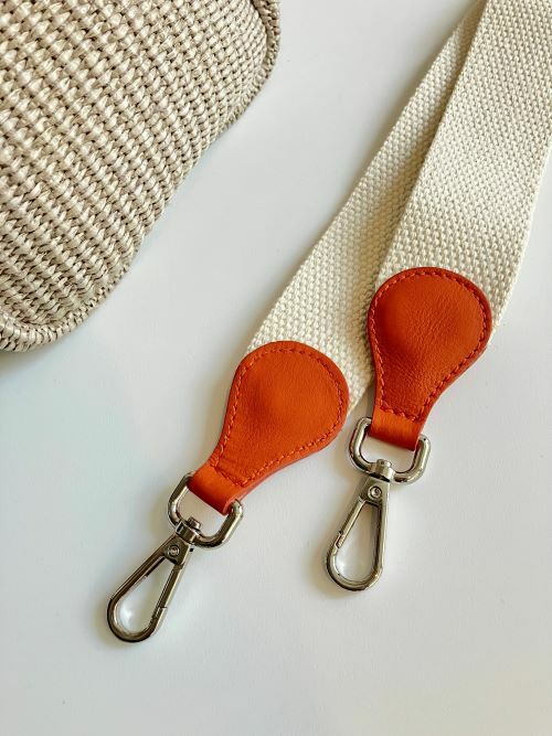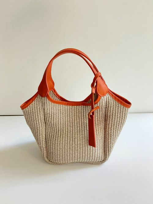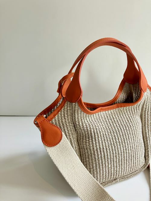 フチのオレンジのレザーがポイントで軽くてマグネット止めが付いています。すごく軽量で最小限の荷物を、収納するのに手軽な大きさです。ショルダーを斜めにかけられても肌当たりも柔らかいので、デイリーに使いやすいカゴバックです。