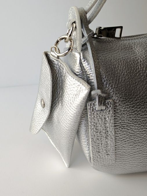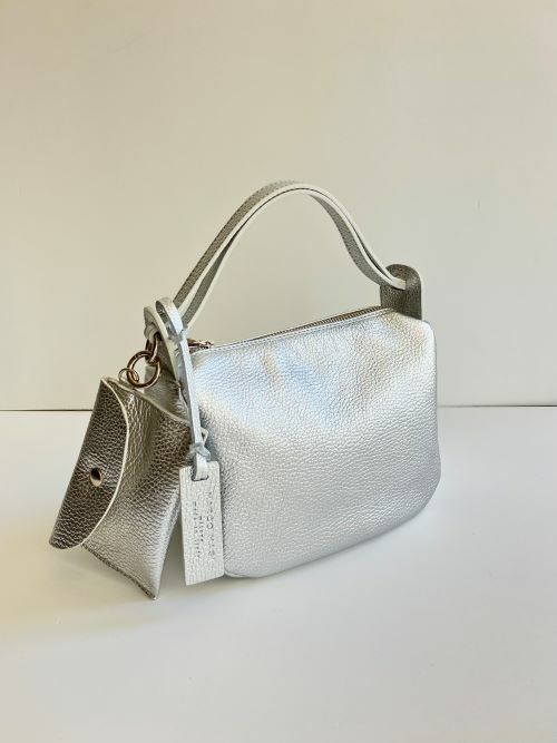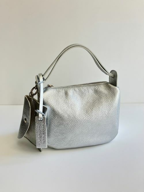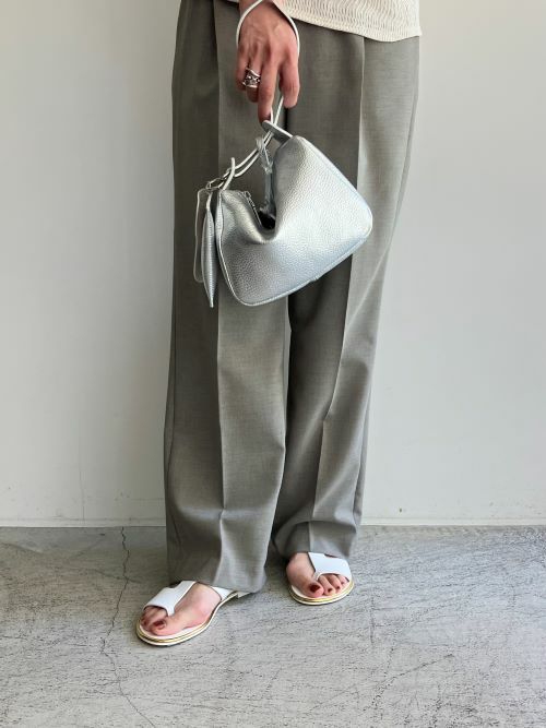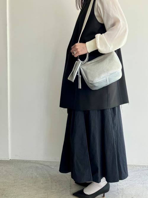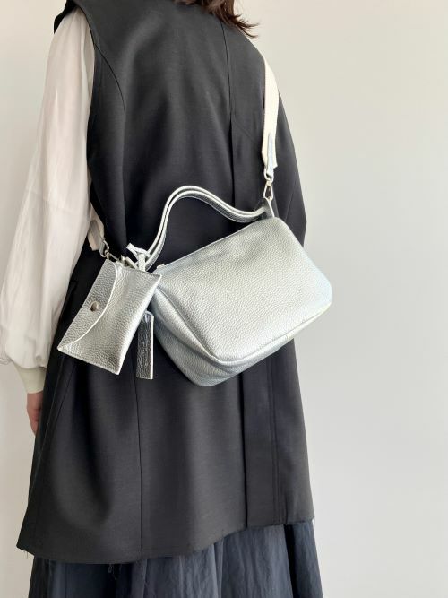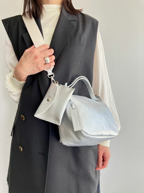 小ぶりでスタイルを選ばないフォルムで持ち手を片側を引っ張ることで丸みが出てコンパクトな印象になります。また少し太めのショルダーが付属で付くので両手をあけたい、ご旅行などにも持っていきやすいです。コンパクトなサイズながらマチがあり、見た目以上に収納力があるのも嬉しいポイントです。また、表にポケットはありませんが、取り外し可能な小物ポーチがついております。合わせるお洋服のカラーも選ばず、スタイリングのポイントになります。
