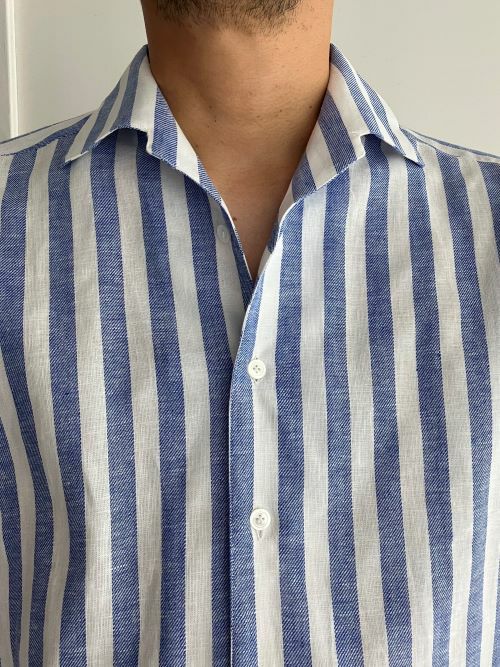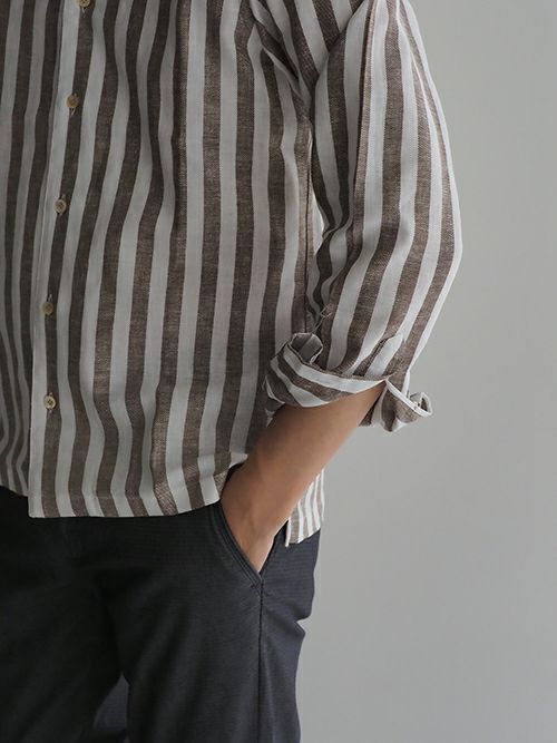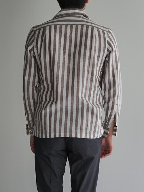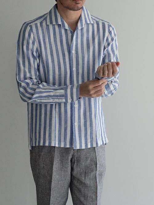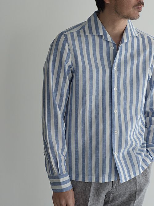 綿麻素材を使用したオープンカラーシャツ。軽やかな着用感で、ブロックストライプが印象的でアクセントになる一着です。