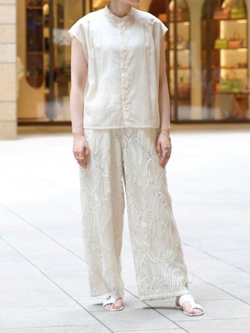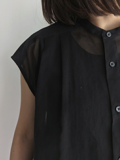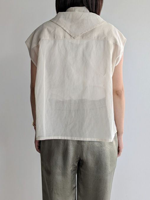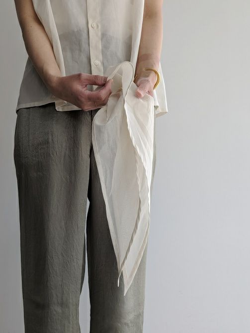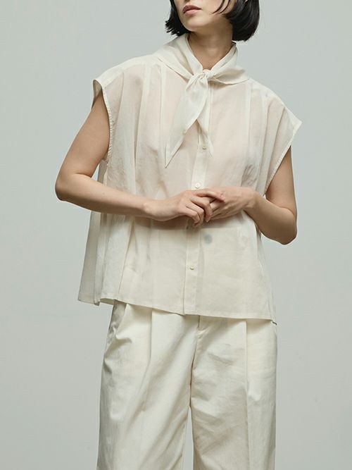 身生地と共地のデタッチャブルのスカーフがアクセサリーとして、着こなしのアクセントをつけてくれるサイドタックノースリーブブラウス。スカーフは、ブラウス本体の衿部分のボタンで着脱可能。