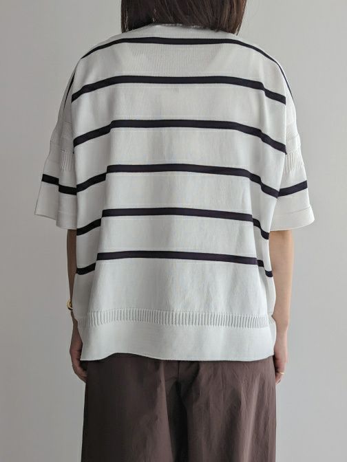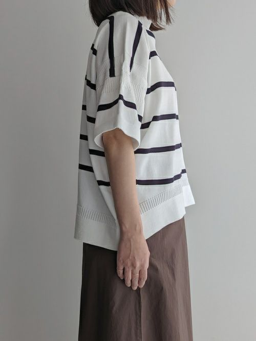オーガニックコットンの中でもピュアホワイトと呼ばれる糸にこ だわったニットシリーズです。Tシャツ感覚で着られる定番の半袖ニットプルオーバー。体のラインを拾わないゆとりあるシルエットと、肘まである5分袖が気になるところをカバーします。ベーシックなボーダー柄に、シルエットで遊び感をプラス。