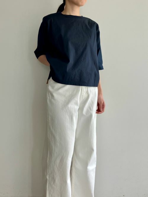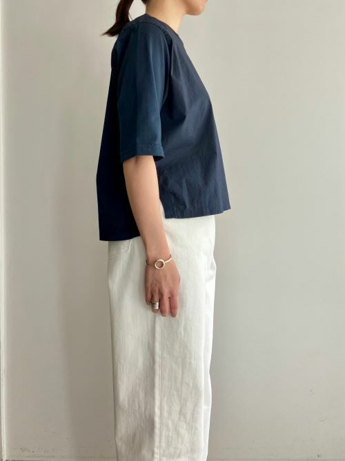 身頃と袖の差材に変化を持たせた5分袖クルーネックカットソー。さらりとした着心地の良い風合いです。デイリー使いがしやすく着丈コンパクトでワイドなパンツやスカートなどボトムにも合わせやすいです。