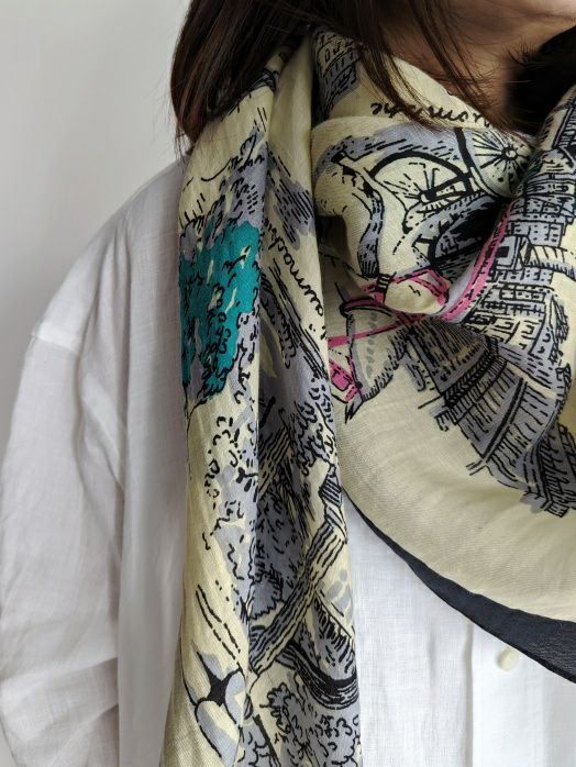 ヴィンテージスカーフからインスピレーションを得てつくられるスカーフは、素材やサイズにもこだわりを持ち、どんな巻き方でも美しく見えるよう計算されています。