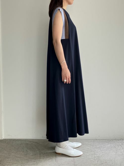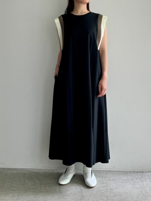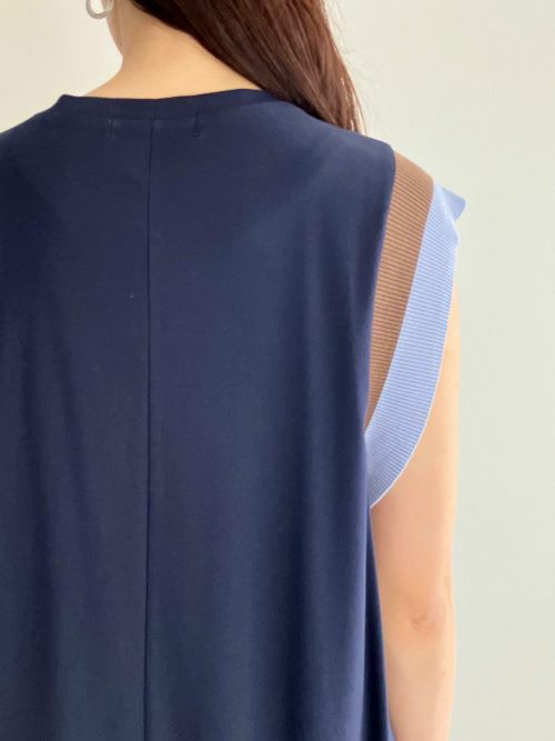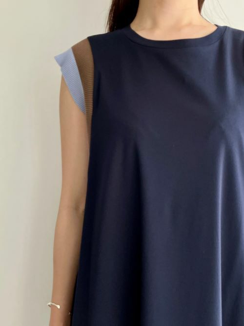 カットソーにニットを合わせたワンピース。ショルダー部分のニットは凹凸がわかりやすい2×2のリブ編みにし、しっかり感を出すために全面にボニーロールというストレッチ補強糸引き揃えました。遊びの効いたデザインにしています。カットソー部分は超長綿使用したソフトで肌触りの良いスムースでバイオシル加工をしており艶のあるきれいな表面感となっております。暑い夏にはうれしい接触冷感素材なので着心地も良いです。デオドラント加工もされております。